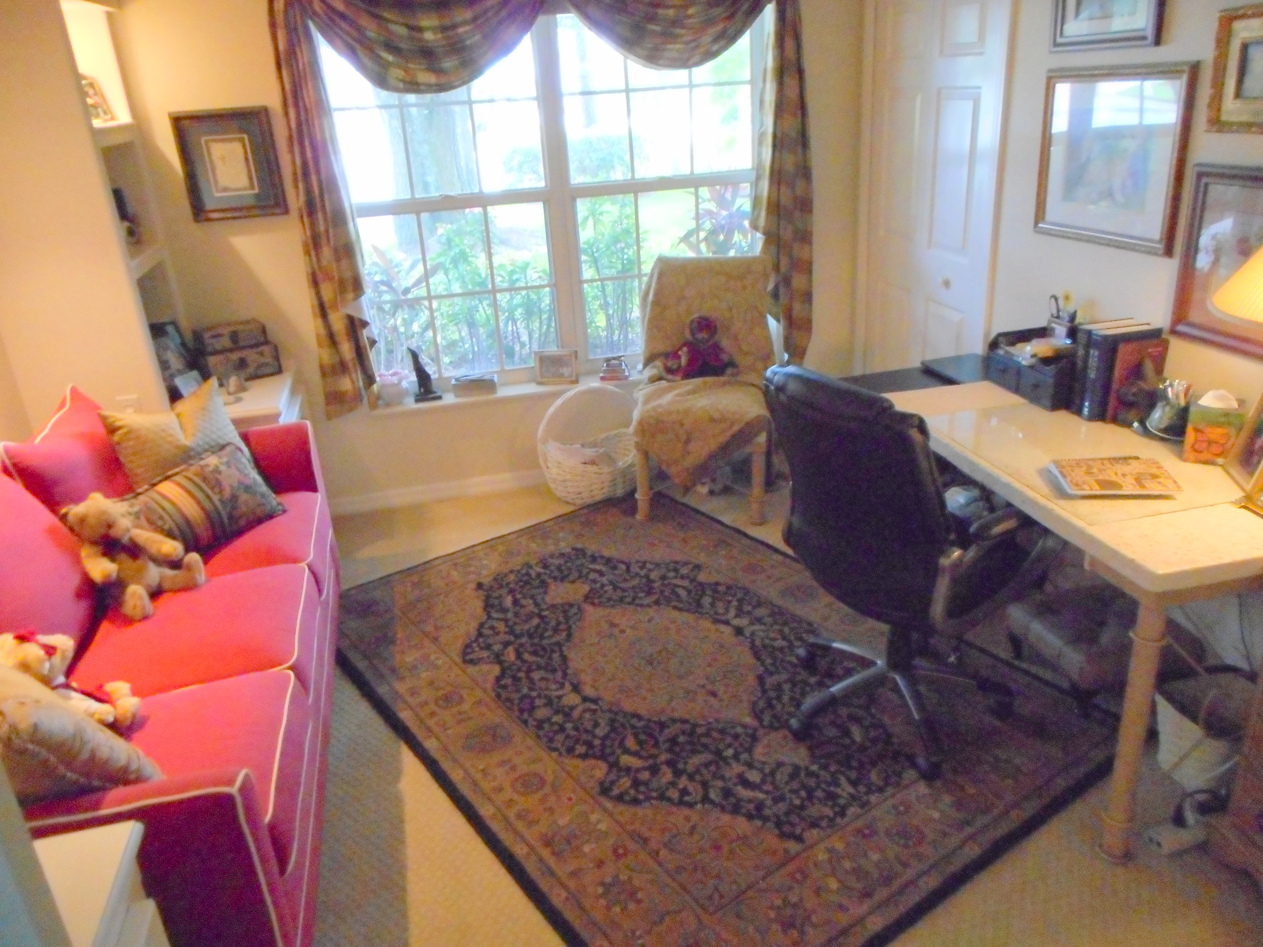 I am by nature a night owl, but the funny thing is my best writing time is in the early part of the day. That is mostly because I think about my story before I go to sleep, often include it in my dreams and wake up anxious to get back to it. I try not to get online until late afternoon because once I start that, I go back to being me and lose the personality of the character I am writing about. I have an office in the front of our house. It is a very serene spot that looks out onto the lawn and a HUGE oak tree. My office has double doors and when they are closed hubby knows not to disturb me. My writing buddy is Sugar. She sits in my lap a good part of the day and when she isn’t in my lap she is under my desk. Her toy basket is in my office and if she gets bored, she rummages through the basket and hauls out a toy for me to throw. We play for five minutes, then it is back to work.