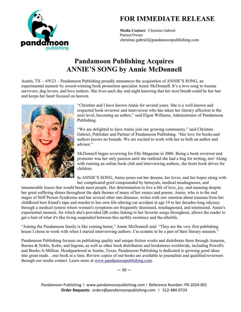 “Poignant, heart-wrenching, riveting, and beautifully-written, Annie’s Song by Annie McDonnell is a must-read for 2023. I loved this unforgettable book so much!”